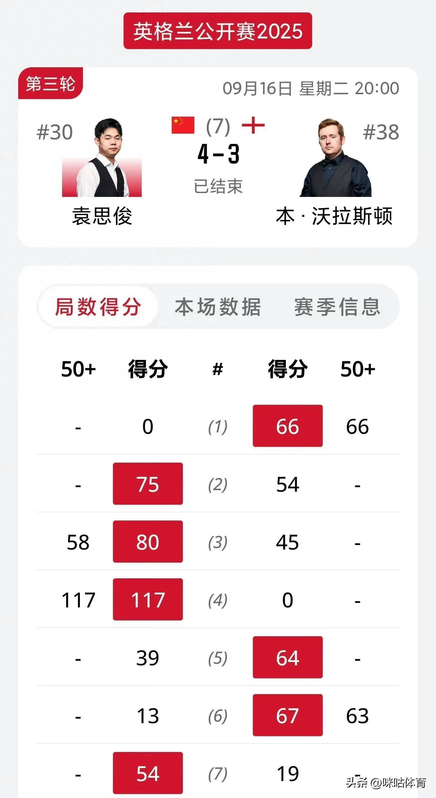袁念念俊得回3-1卓绝,沃拉斯顿武断扳平,袁念念俊最终拿下决胜局,4-3打败敌手。全场比赛他打出一杆117分和一杆50+。
