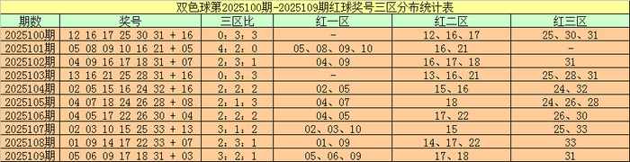 双色球第2025109期奖号为:05 06 09 17 18 31 + 03,红球三区比为3:2:1。