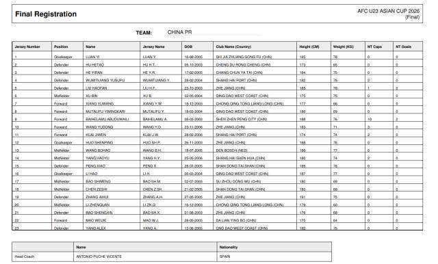 1月4日,亚足联公布2026年U23亚洲杯大名单,最终,守门员姚浩洋、后卫张一轩、中场依木兰·买买提、时尚朱鹏宇落第中国U23参赛名单。