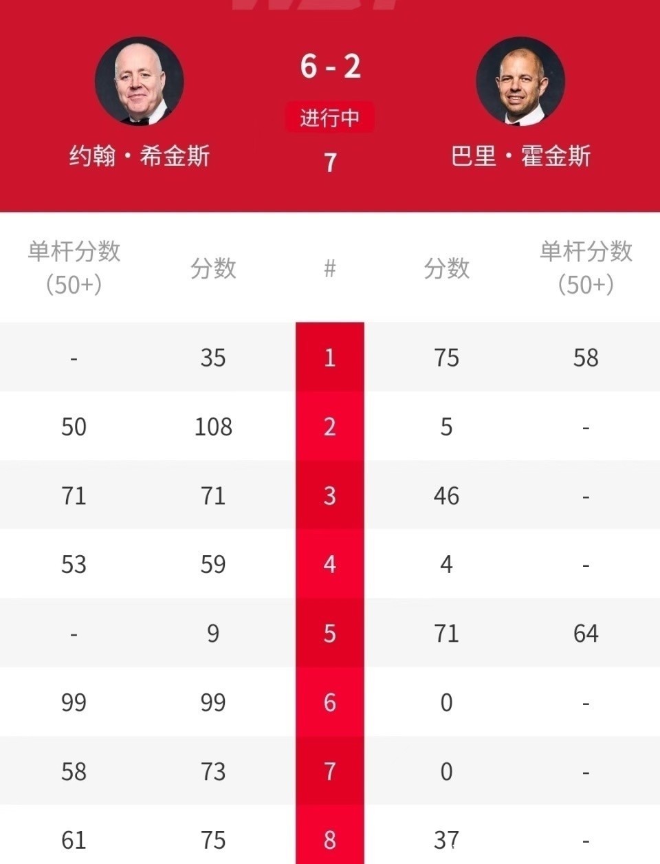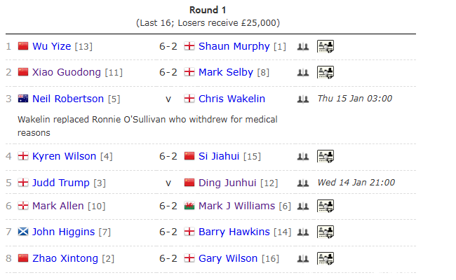 前两个比赛日限度后,四场比赛的比分齐是6-2,共有3个中国选手晋级八强。来到1/8决赛第三个比赛日,又打出2个6-2的比分,“囧哥”凯伦-威尔逊以6-2校服斯佳辉,“巫师”希金斯以6-2校服霍金斯。那么,接下来的两场比赛,会是2个6-2吗?